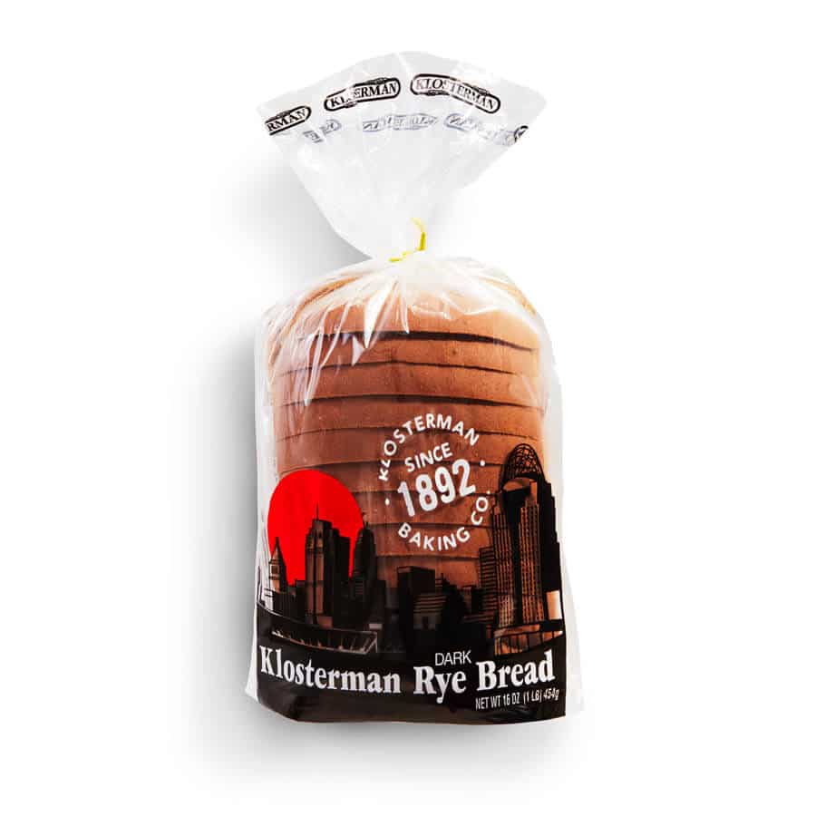 16 oz round-top sliced dark rye half loaf is packed in Klosterman branded printed packaging. Designed for both CPG commercial grocery shelf and foodservice accounts.